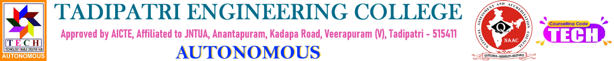 Tadipatri Engineering College (TECH) established in the academic year 2010. Affiliated to the Jawaharlal Nehru Technological University, Anantapuram, the college offers B.Tech, M.Tech, and diploma courses across various specializations, such as Civil Engineering, Computer Science Engineering, Electrical, and Electronics Engineering, Electronics and Communication Engineering, and Mechanical Engineering, etc.